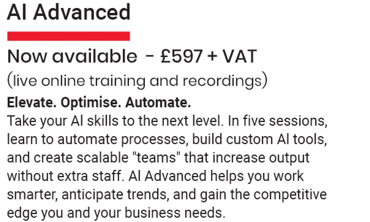 Ideal for professionals and organisations who’ve mastered the basics and are ready to harness AI for growth, innovation, and competitive advantage.