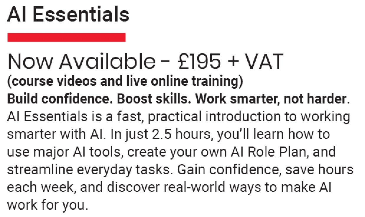 AI Essentials is your fast-track introduction to working confidently and effectively with artificial intelligence. Whether you’re an individual or part of a team, this hands-on session shows you exactly how to make AI work for you.